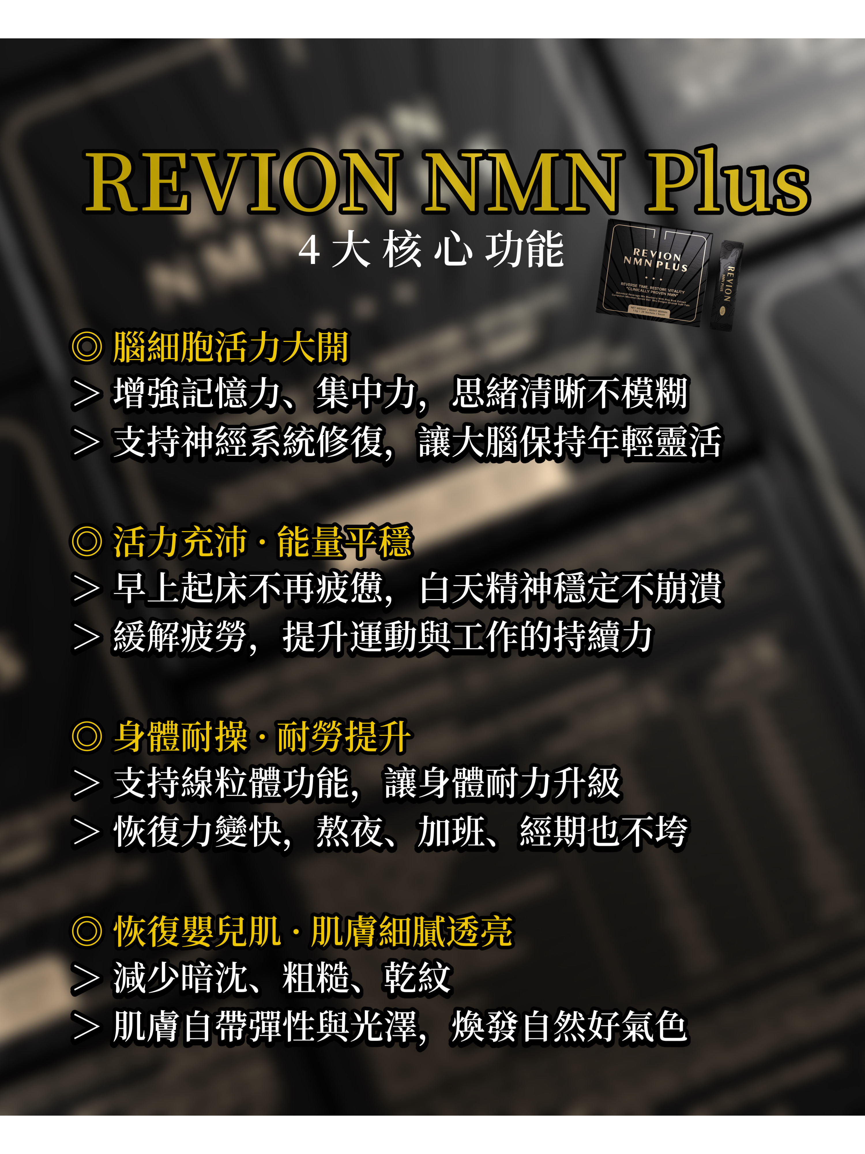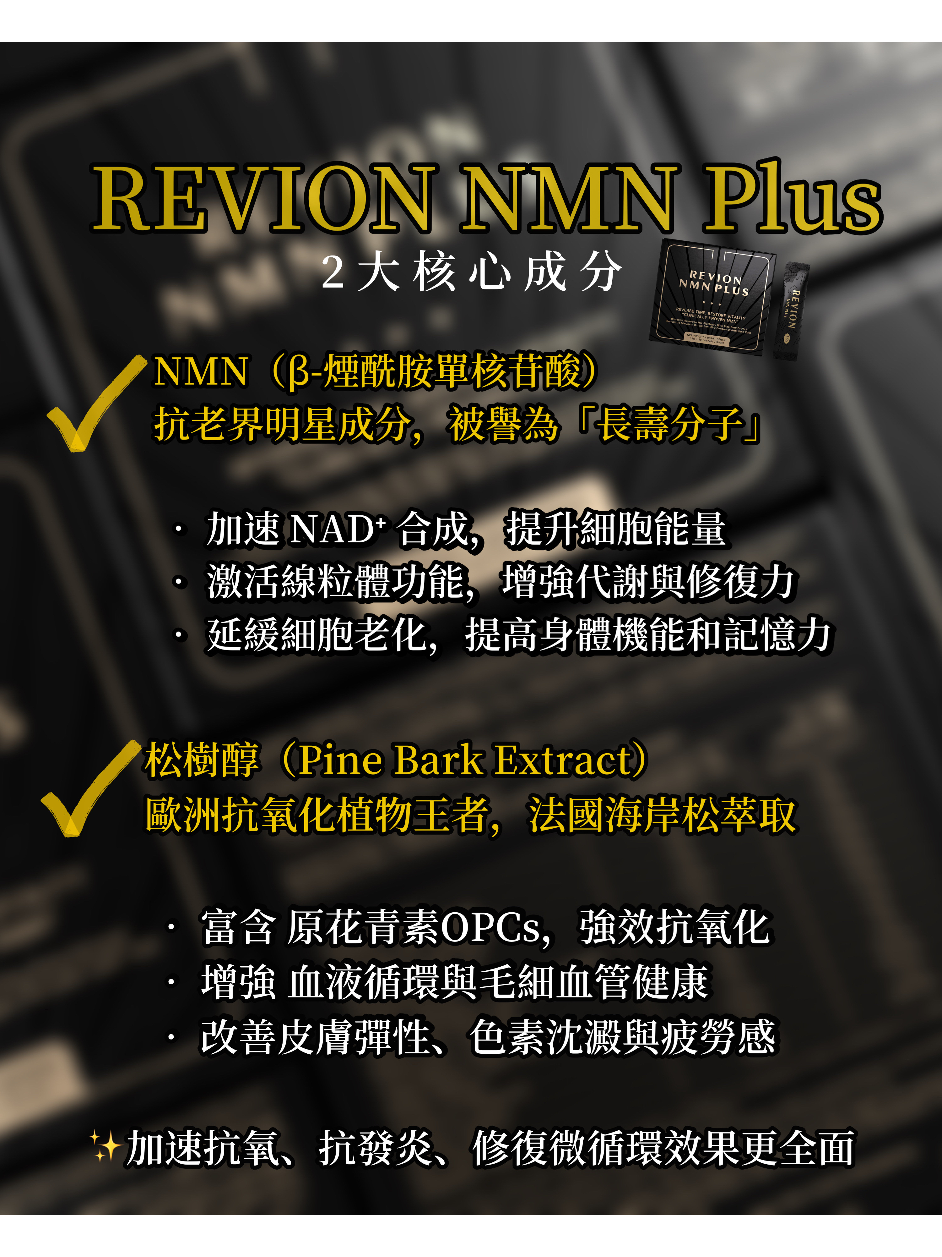 Revion NMN 逆齡神器🖤 如果你… 成日捱夜返工無精神😭 經常斷電自動瞓着 或者皮膚炎症問題嚴重的話 一定要試試!! 親身實測14天見效🖤 🉐專業醫生🩺 臨床實驗 產品安全認證🧪📑 🔬【2大核心成分】 ✅ NMN(β-煙酰胺單核苷酸) —— 抗老界明星成分,被譽為「長壽分子」 • 加速 NAD⁺ 合成,提升細胞能量 • 激活線粒體功能,增強代謝與修復力 • 延緩細胞老化,提高身體機能和記憶力 ✅ 松樹醇(Pine Bark Extract) —— 歐洲抗氧化植物王者,法國海岸松萃取 • 富含 原花青素OPCs,強效抗氧化 • 增強 血液循環與毛細血管健康 • 改善皮膚彈性、色素沈澱與疲勞感 我們搭配了松樹醇(pine bark)、還可以加速抗氧、抗發炎、修復微循環,效果更全面!❤️🔥❤️🔥❤️🔥 ⋯⋯⋯⋯⋯⋯⋯⋯⋯⋯⋯⋯⋯⋯⋯⋯ 五大主打成分🔛 🧬NMN — 修復受損DNA 抗衰老 🪵松樹皮萃取物 — 最強抗氧化劑 保護DNA🛡️ 🫐藍莓 — 富含花青素&多酚 減少炎症 🍇黑莓 — 清除毒素 減少炎症 協助肝臟排毒 ✨維生素E — 強效抗氧化 促進傷口癒合 增強🧠功能 提升免疫力🔝 ✨【4大核心功能】 ◎ 腦細胞活力提升 > 增強記憶力、集中力,思緒清晰不模糊 > 支持神經系統修復,讓大腦保持年輕靈活 ◎ 活力充沛 · 能量平穩 > 早上起床不再疲憊,白天精神穩定不崩潰 > 緩解疲勞,提升運動與工作的持續力 ◎ 身體耐力提升 > 支持線粒體功能,讓身體耐力升級 > 恢復力變快,熬夜、加班、經期也不垮 ◎ 恢復嬰兒肌 · 肌膚細膩透亮 > 減少暗沈、粗糙、乾紋 > 肌膚自帶彈性與光澤,煥發自然好氣色 ⋯⋯⋯⋯⋯⋯⋯⋯⋯⋯⋯⋯⋯⋯⋯⋯ 🧬 主打的【7大解析】 1. 延緩衰老、逆齡回春 • 原理:NMN是體內NAD⁺的前體,而NAD⁺是人體細胞維持年輕不可或缺的關鍵分子。 • 活化長壽基因(Sirtuins) • 延緩細胞老化過程 • 逆轉生理年齡 👉 適合:追求抗老、美容、養生族群 2. 提升能量與代謝 • 原理:通過提高線粒體功能,加速能量轉換效率。 • 起床有精神、不再早起疲憊 • 運動後不容易累、恢復力快 • 減少午後疲倦感 👉 適合:上班族、常熬夜、學生、運動數據 3. 增強免疫系統 • 原理:NMN可提高免疫細胞的活性與數量,維持免疫平衡。 • 少感冒、身體不容易出狀況 • 對慢性疲勞/亞健康狀態有改善 👉 適合:體質弱、容易生病、過敏體質者 4. 改善睡眠質量 • 原理:調節生理節律(晝夜節律),讓身體在夜晚自然修復。 • 深睡比例提升、入睡速度更快 • 睡醒不再覺得“睡不夠” 👉 適合:失眠人群、睡眠斷斷續續者 5. 提升記憶力與腦部機能 • 原理:增加大腦神經元對能量的利用率,改善認知能力。 • 思緒清晰不混亂 • 老年預防腦部退化、年輕人改善腦霧 👉 適合:銀發族、長期用腦、上課學習者 6. 美容護膚 · 淡斑緊致 • 原理:抗氧化 + 抗糖化雙重機制,減少肌膚老化痕跡。 • 改善細紋、斑點、膚色暗沈 • 肌膚更有彈性與透明感 👉 適合:想要“內調外養”的女性族群 7. 體重管理 · 改善胰島素敏感 • 原理:支持胰島素功能、增強葡萄糖代謝 • 幫助控制體脂、瘦得更輕鬆 • 降低胰島素阻抗,改善代謝綜合症 👉 適合:代謝差、減重困難、體脂高人群